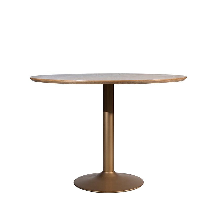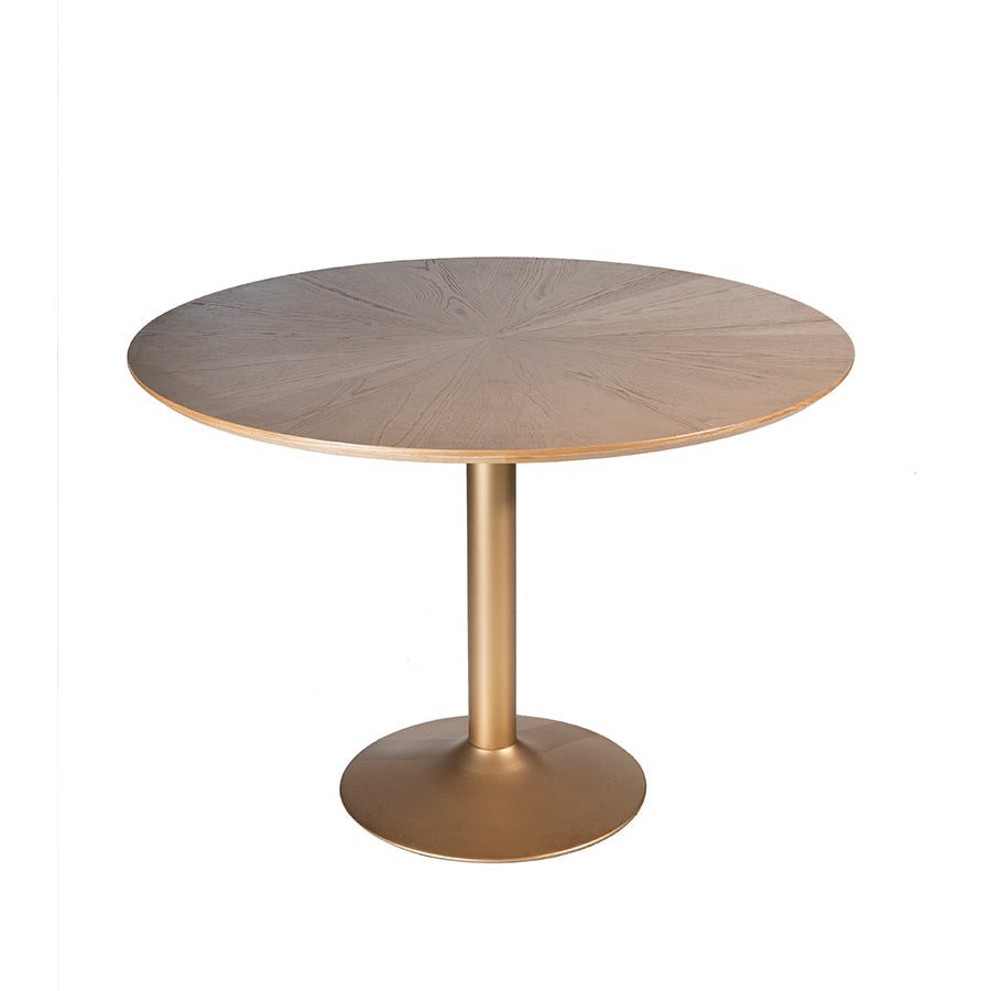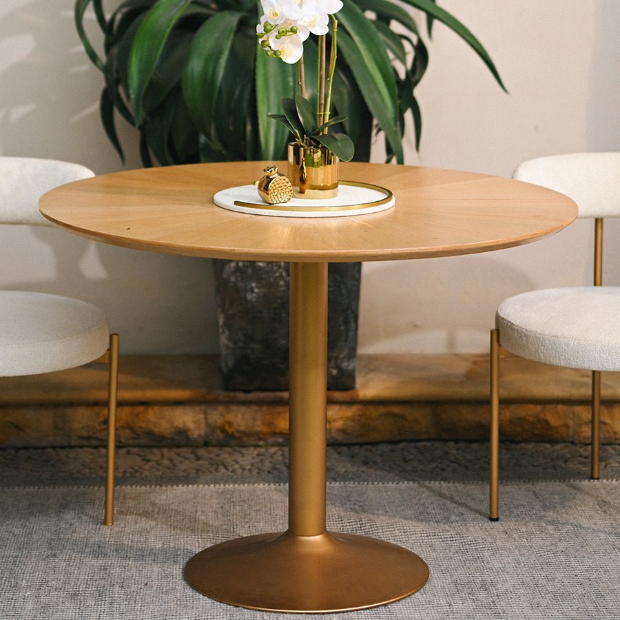 Chat with us, powered by LiveChat 82-Inch Round Oak Dining Table with Gold Pedestal - Shymofy