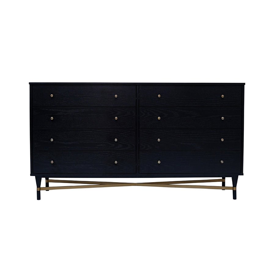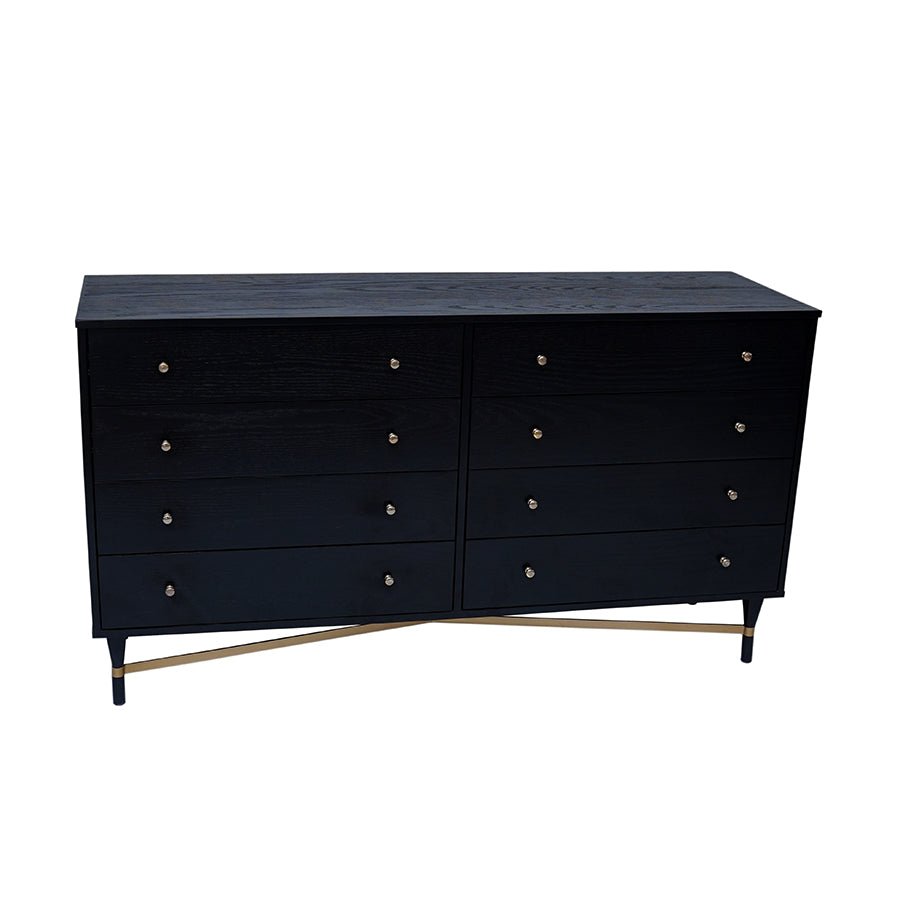 The design is elevated with brass knobs and decorative crossbars, creating a luxurious contrast against the dark finish. A sturdy black iron frame provides excellent support and structural stability, giving the dresser a contemporary industrial appeal that complements a wide range of interior styles.