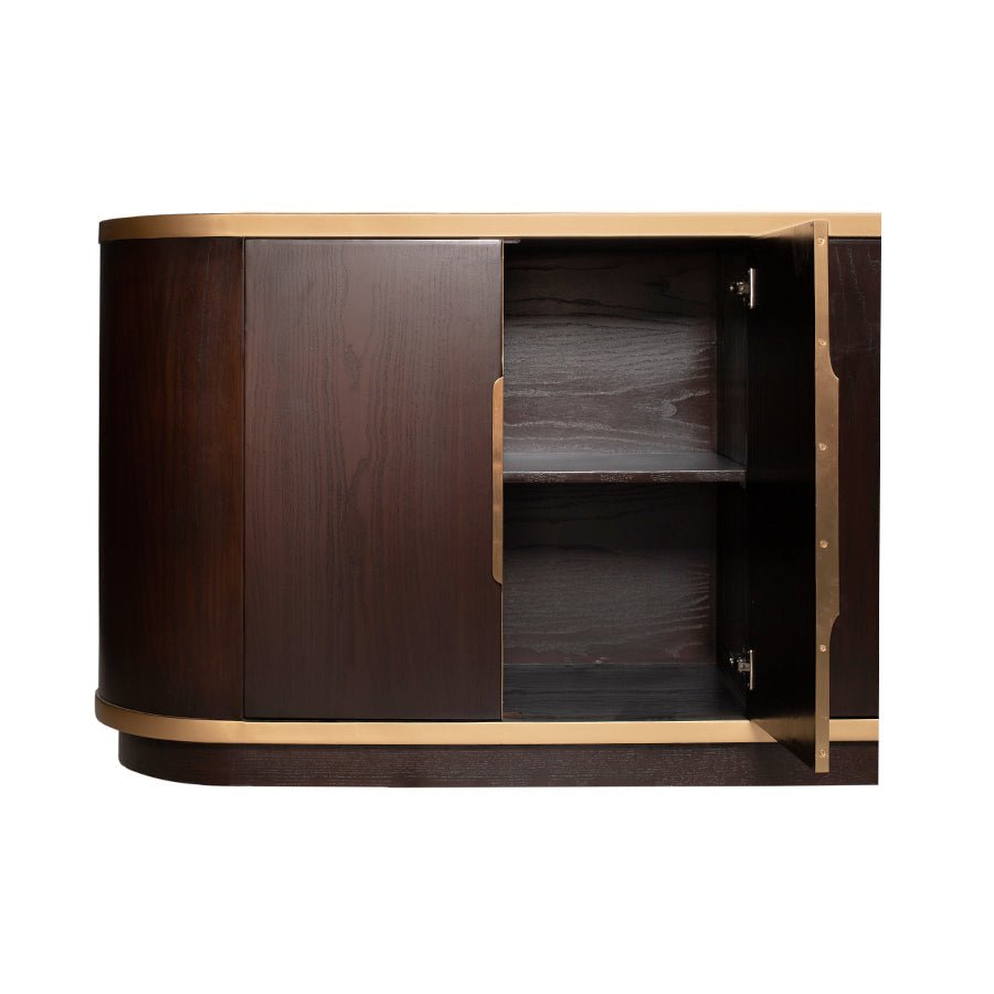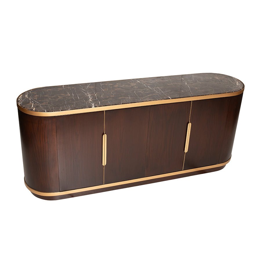 The striking natural black marble top adds a luxurious touch, while the brass handles and accents create an elegant contrast that complements modern and contemporary interiors. Its gently curved silhouette adds architectural interest, making the sideboard a stylish centerpiece for living rooms, dining rooms, or entryways.