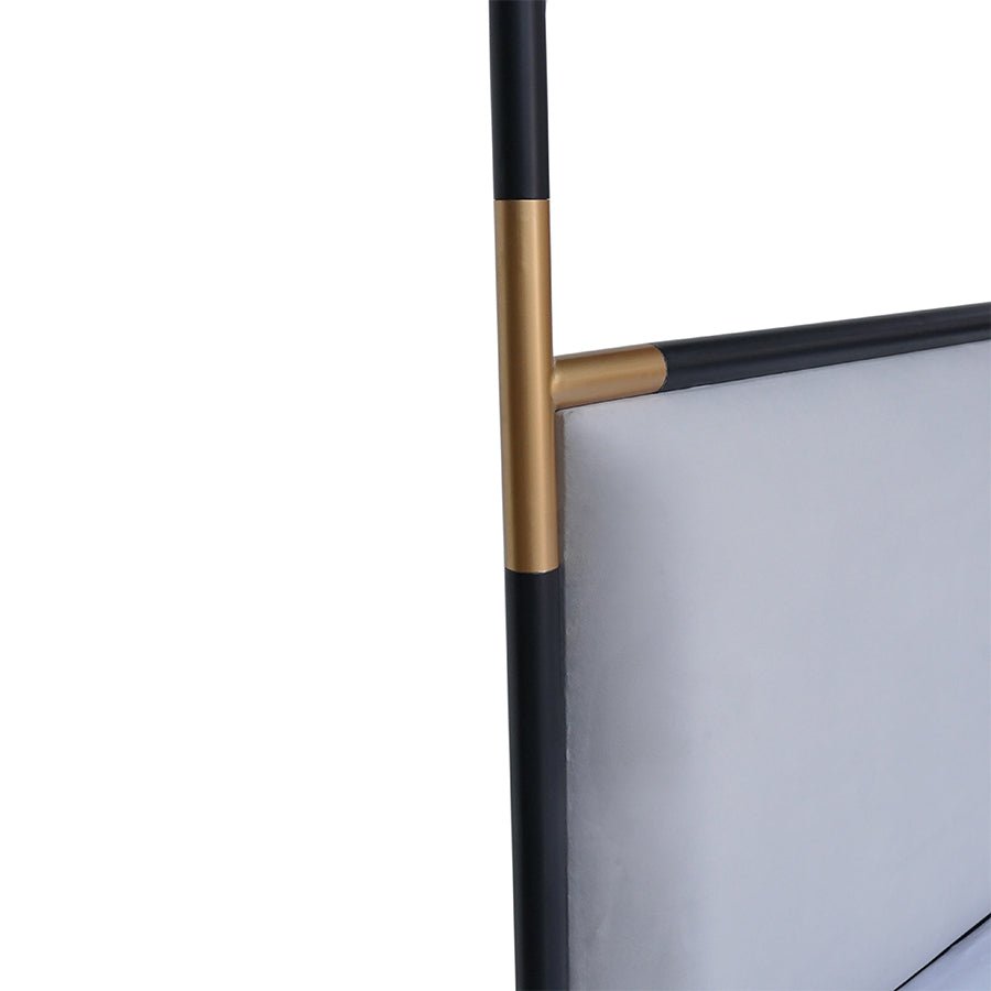 Create a striking focal point in your bedroom with the Luxury Grey Velvet Canopy Platform Bed with Gold Metal Frame & Acrylic Accents. Designed with a bold contemporary canopy structure, this elegant bed combines a soft grey velvet upholstered headboard with a sleek gold-painted metal frame and clear acrylic posts, delivering a refined and modern designer look.