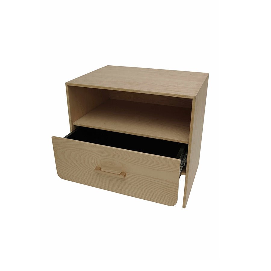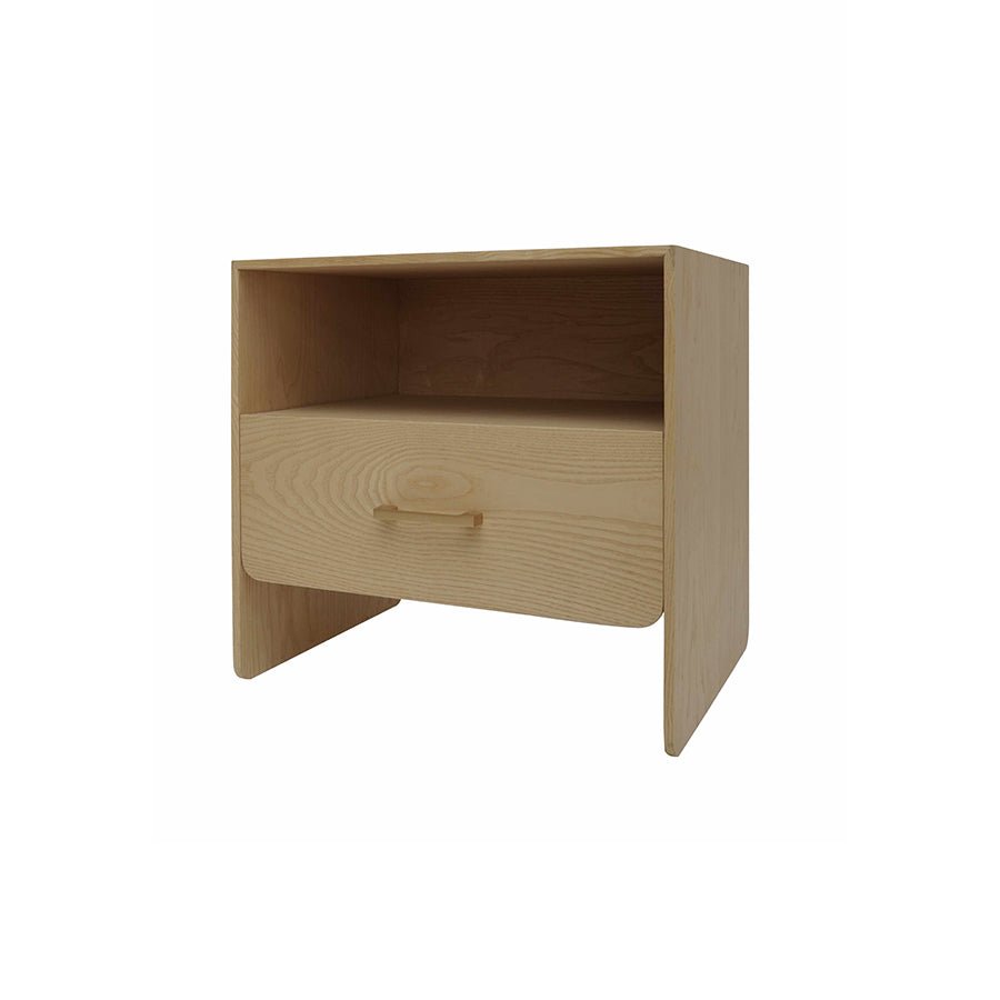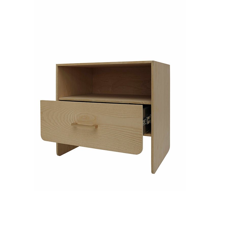 • One storage drawer and open shelf for organized bedside storage